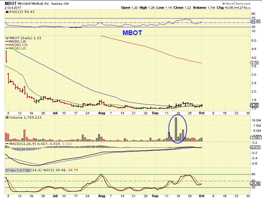MBOT – MBOT is another base that I pointed out a month ago or so. So I still think that MBOT is a good set up, it too has had some nice volume surges, but the consolidations continues (for now). This could go at any time – Buy & hold or keep it on a watch list and check it often.