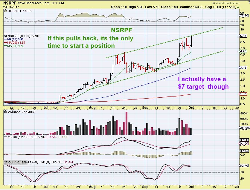 NSRPF– This Miner is ridiculously bullish looking. I have a price target of $7, and it is hardly dipping down to let anyone on board (As Gold sells off). Look at this – 50 cents to $6 in less than 3 months.