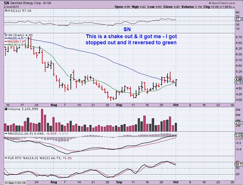 SN – I use loose stops, but I got stopped out of SN yesterday and it reversed back above the 50sma, so this one is still bullish.