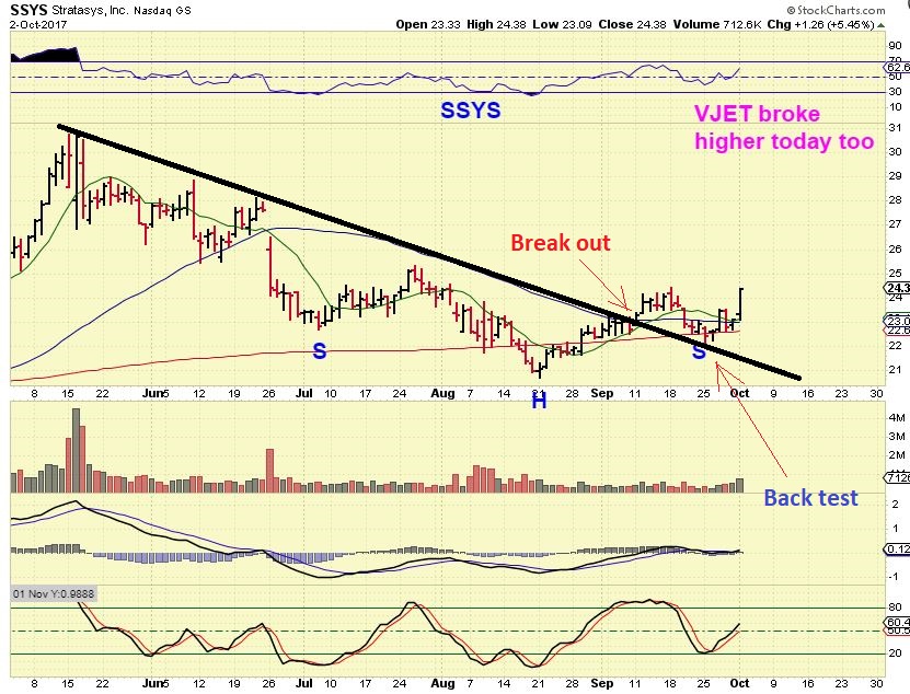 I pointed out that SSYS was breaking out on September 12th. The break was of the 50sma and the down trend line