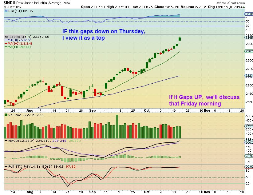 DJIA– Though this looks really bullish, it is often an exhaustion candle. If it gaps down and leaves a big gap on Thursday, I immediately sell. I mentioned yesterday, once 23,000 is tagged, it could be a short term top, similar to 22,000 & 21,000 a day or 2 later.