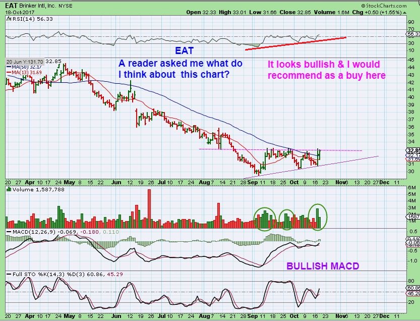 EAT – BY request. Yes, I like this a lot- please read the chart, it is a buy right here in my opinion. It MIGHT need time to move into the APEX, but it looks like it really just wants to go higher now.