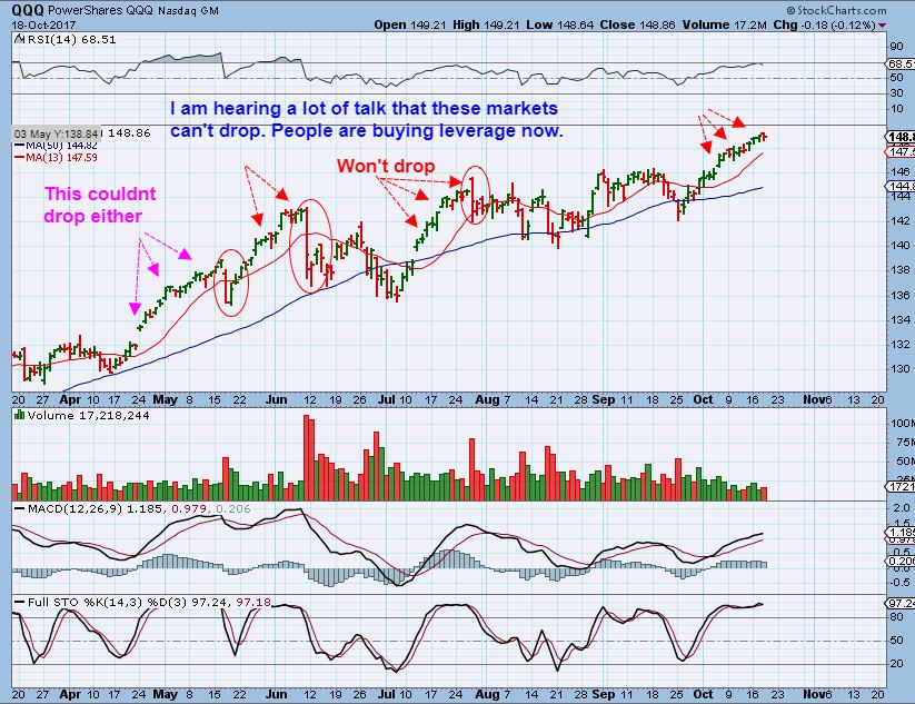 QQQ – I am hearing talk that these markets can’t drop again. ” Everyday the markets go higher, nothing can drop these markets.” In the past when this talk gets circulating, we get enough of a 1 day drop to erase 10 + trading days & scare the daylights out of everyone. I have a new theory on what is happening here, pertaining to these crashes. PLEASE USE STOPS.