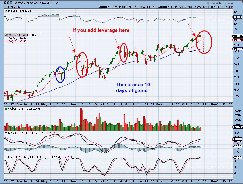 QQQ #2 – I DO REMEMBER, and you probably do too, the comments that were happening at these tops. I wrote the same type of report back then. When bullishness gets so frothy that people are adding leverage this late in the game, and they know that we are late in a daily cycle, it is dangerous. One can lose a lot in 1 day lately. 2 to 3 weeks of trading were wiped out in 1 or 2 days in the past.