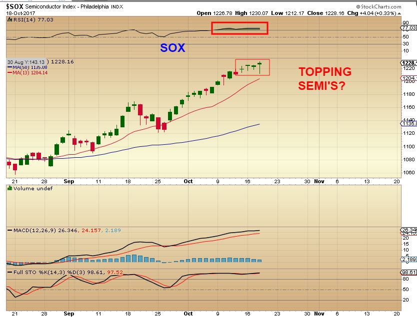 SOX – The semis could be topping right here, we’ll see- obviously this same candle occurred each day lately & it still went higher, so time will tell, but this cluster looks toppy.