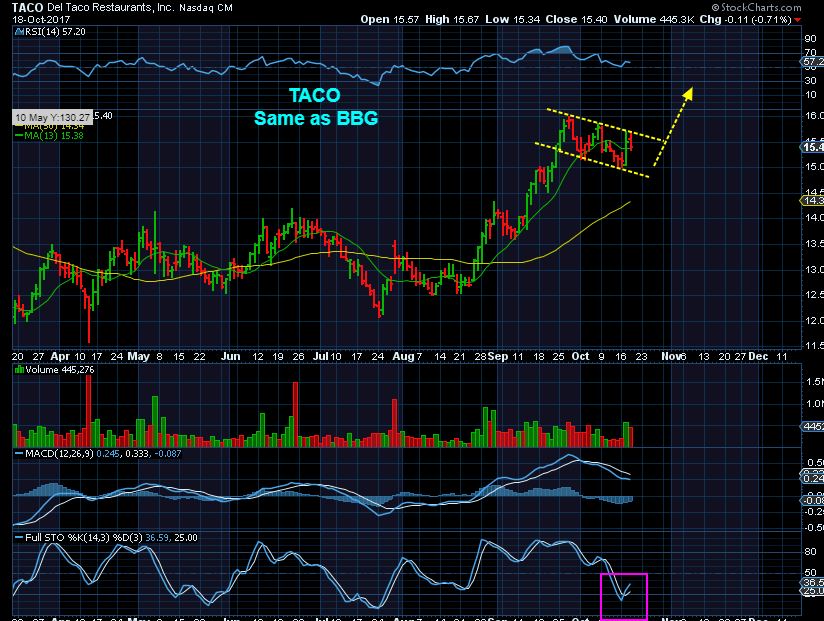 TACO- I was asked about this stock ( Someone was hungry yesterday? Same person asked about ‘Eat” – 🙂 Thanks Frank). This looks similar to BBGs set up, so yes, bullish looking on a break out.