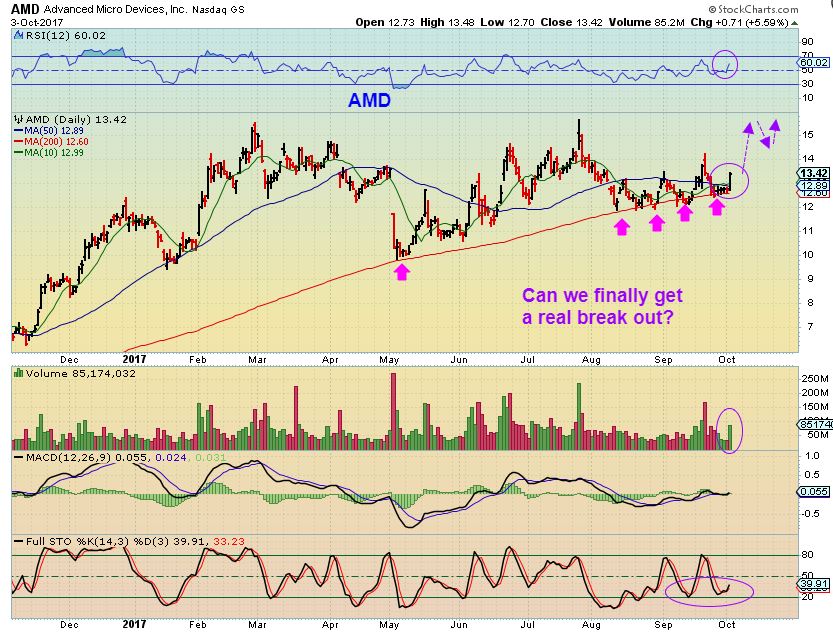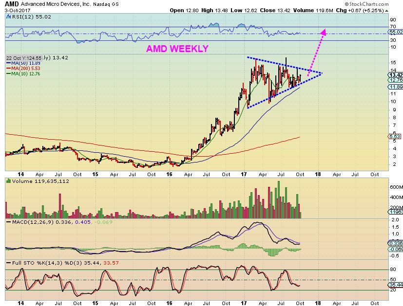 AMD #2 WEEKLY – The weekly chart shows that this could be a huge triangle or bull flag. When it breaks out AMD could run into the 20’s and more very quickly…