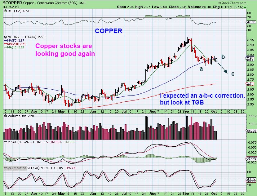 COPPER – I thought that Copper might do an A-B-C type correction, but based on Copper stocks (leading the way?), I think Copper may simply move higher.