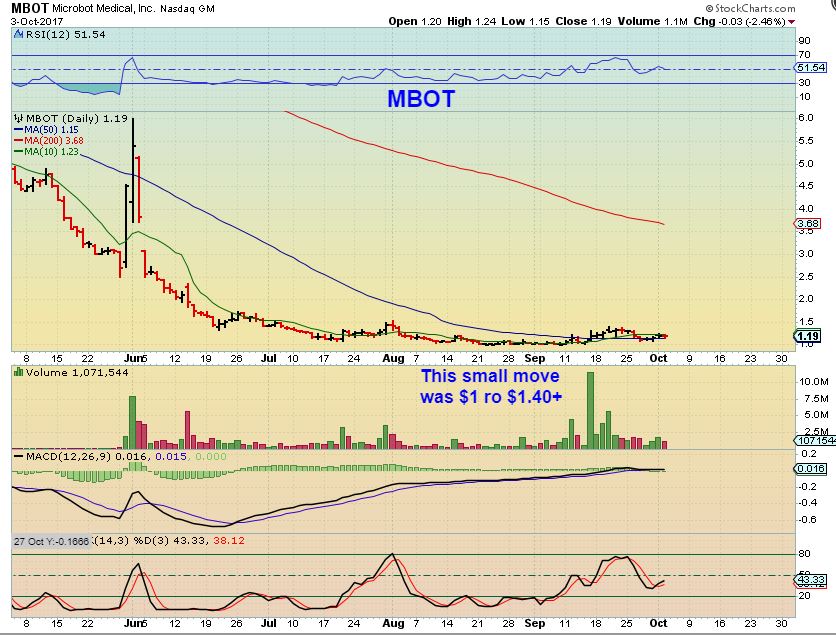 MBOT – I have already pointed this out for a while now. It is a 3 month base, and some of those others were even longer, so this MAY NOT be quite ready, but I liked what I read about the company, and the set up looks very good. THIS IS NOT AN EASY RIDE if you over fund it. It went from $1 to $1.40 and back to under $1 recently. So either watch it daily and buy a break of the $1.50 & take your chances with follow through, or buy it and forget it as it pops & drops ( Easier said than done, trust me).