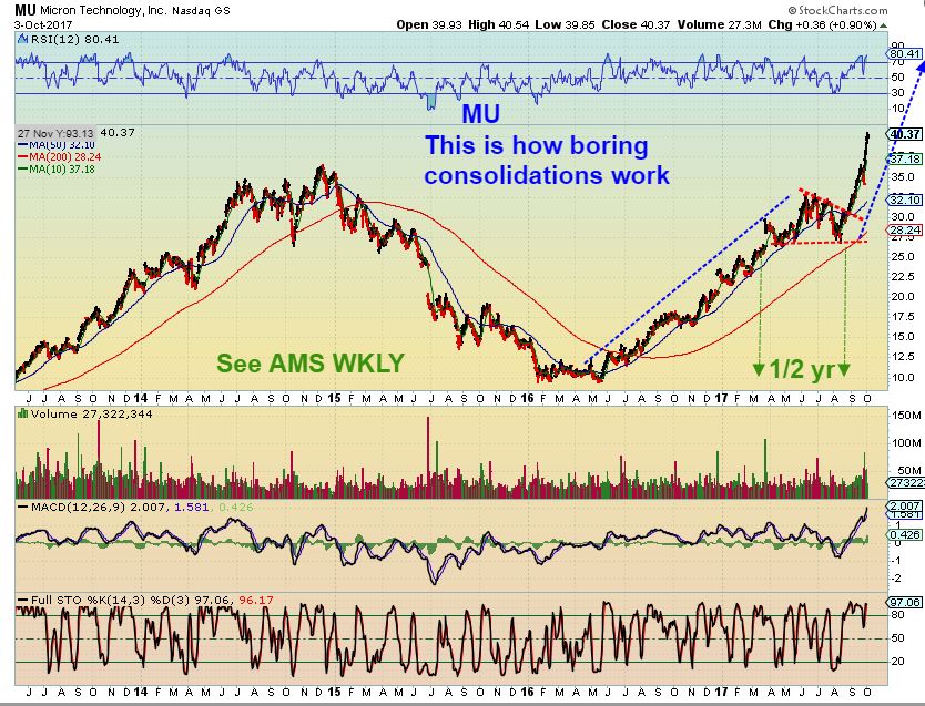 MU WEEKLY – I have pointed out many many times in the past, most people would love to buy & hold these great runners, but the big consolidations bore them to death and they often sell early. MU broke from its consolidation and it just ran $27 to $40.50 in a straight line move.