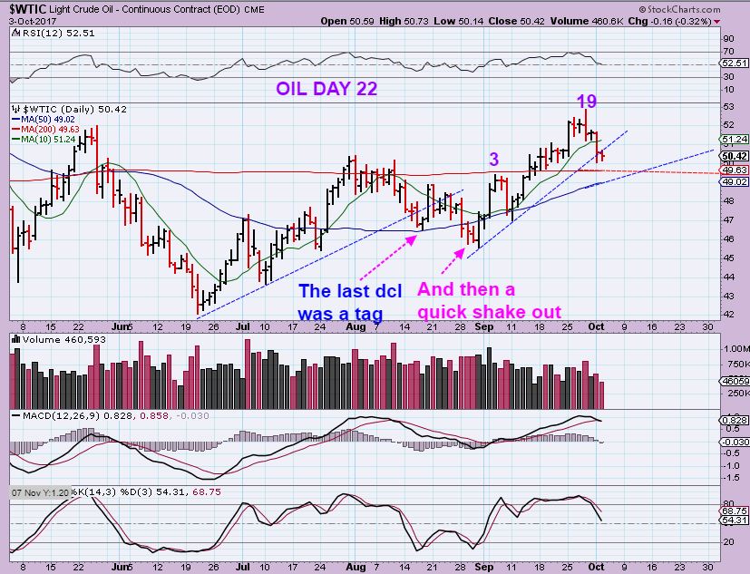 Starting with Oil – Oil broke the trend line with a day 19 peak. We would need to see a dcl by day 38 to get a R.T. Daily cycle. Oil stocks still look good, so I am wondering if Oil will just drop to the support and bounce around like it did in the first daily cycle. Notice that it did a bounce off of the 50sma, and then a shake out. That took weeks of sideways action.