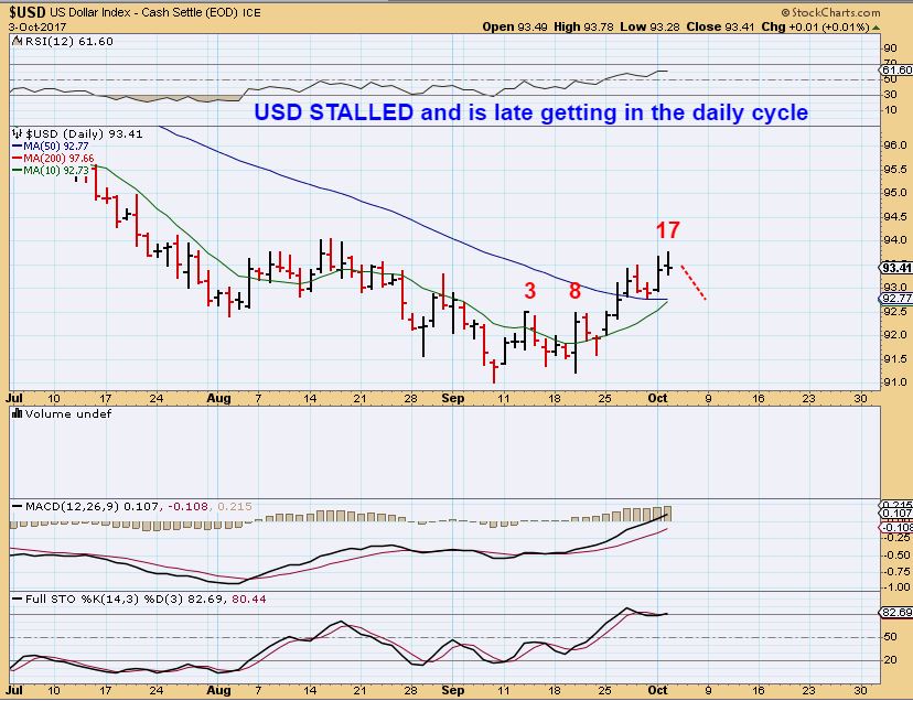 USD – Now with a peak on day 17, the USD is due for a dcl, and may begin to move sideways or drop down from here.