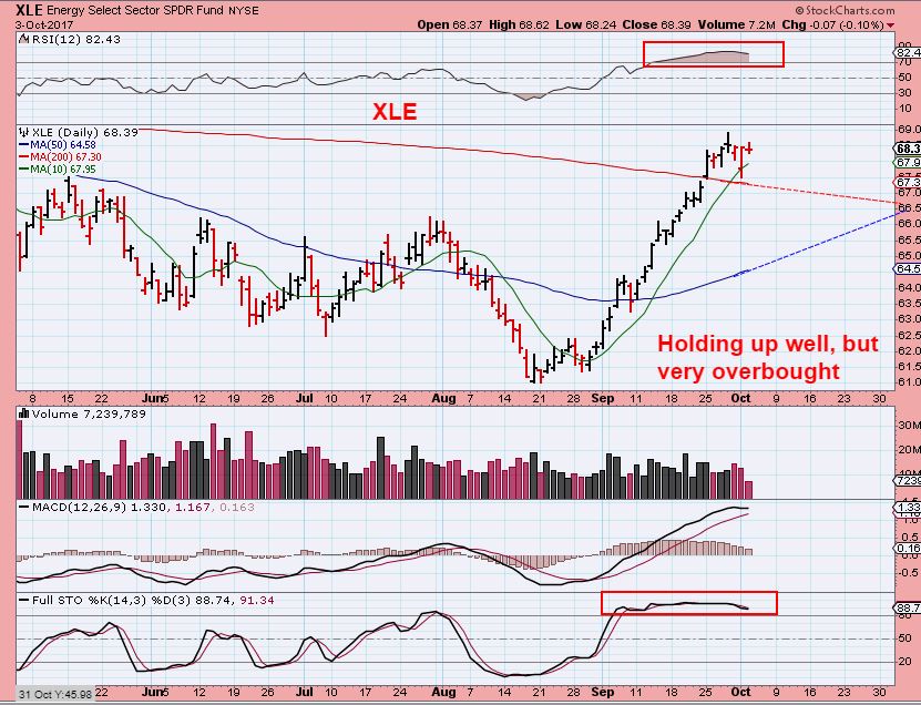 XLE – After ripping higher to extremely over bought conditions, you would expect a drop when Oil drops, but at this point, a sideways move along the 200sma could alleviate overbought conditions.