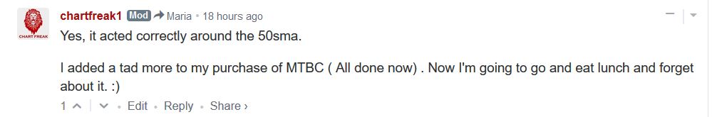 So yesterday I wrote in the comments that I just bought MTBC ( it was only up a few cents, but volume was strong and it had a long base that showed a pattern that I like). I then wrote that I added to that position when it was up 10 cents mid day and was going to lunch. This was that comment.