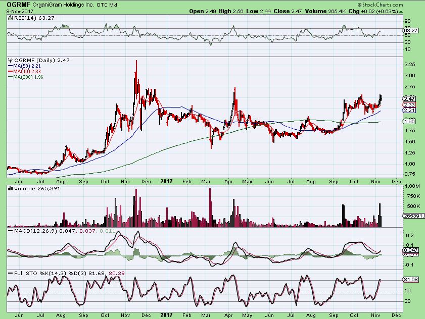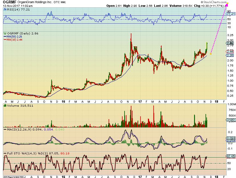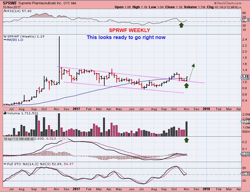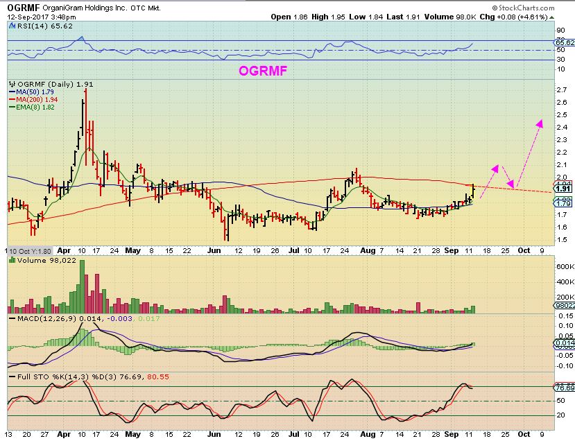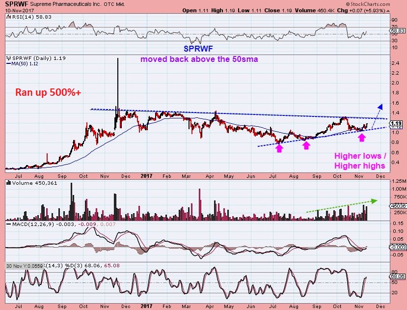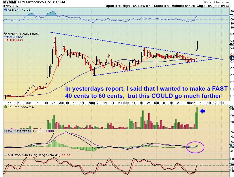 I have mentioned many of these in the comments section, and also in recent reports with plenty of different charts ( a few will be re-posted below). I was really pounding the drum on MYMMF over the last 3 weeks, because of the research that I had done. Many Canadian MJ stocks were setting up very bullishly, and the growth potential that this MYMMF company has in the sector was hitting the news. I recommended it in recent reports with OGRMF and APHQF. It is up 200% since I bought it days ago.