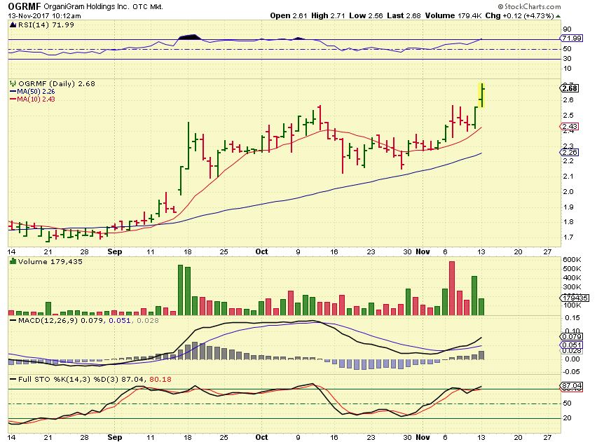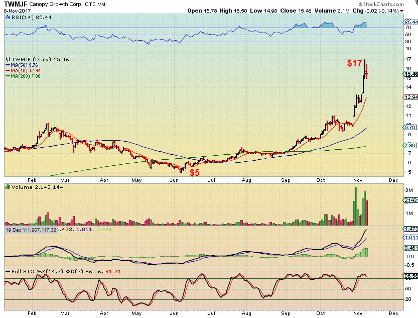 For those that have been following my thoughts on some of these Canadian Medical Marijuana stocks, they are on fire. Canada is in the process of legalizing this industry and growth is happening fast. In the U.S. , this sector took a bit of a slow down when Jeff Sessions became attorney general and publicly let it be known that he is opposed to legalized medical Marijuana. Do not let that make you think that this entire sector has been adversely affected. As I have mentioned before- Canadian MJ stocks have been ON FIRE.