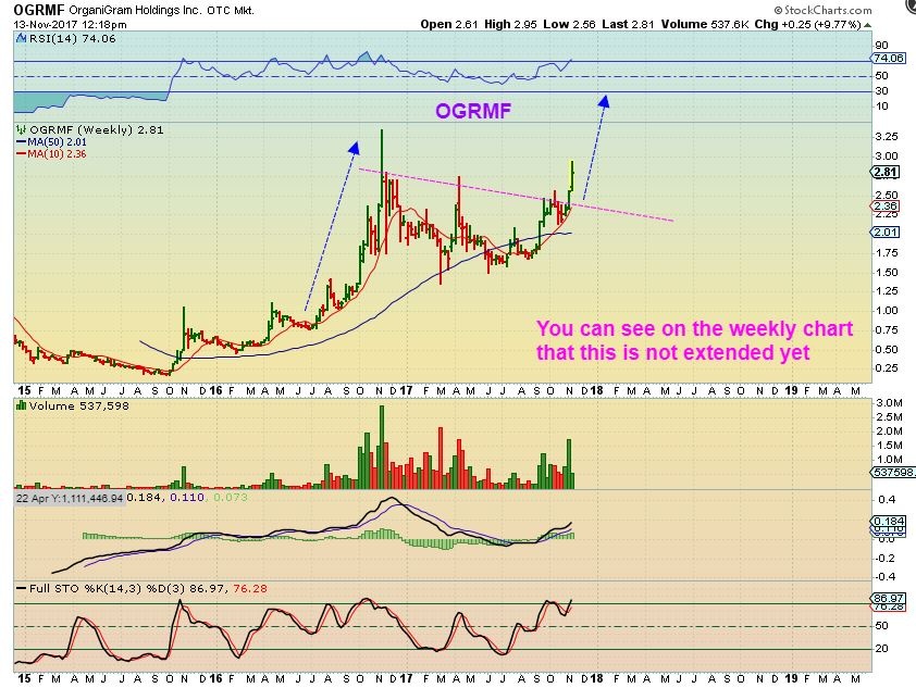 I have mentioned many of these in the comments section, and also in recent reports with plenty of different charts ( a few will be re-posted below). I was really pounding the drum on MYMMF over the last 3 weeks, because of the research that I had done. Many Canadian MJ stocks were setting up very bullishly, and the growth potential that this MYMMF company has in the sector was hitting the news. I recommended it in recent reports with OGRMF and APHQF. It is up 200% since I bought it days ago.