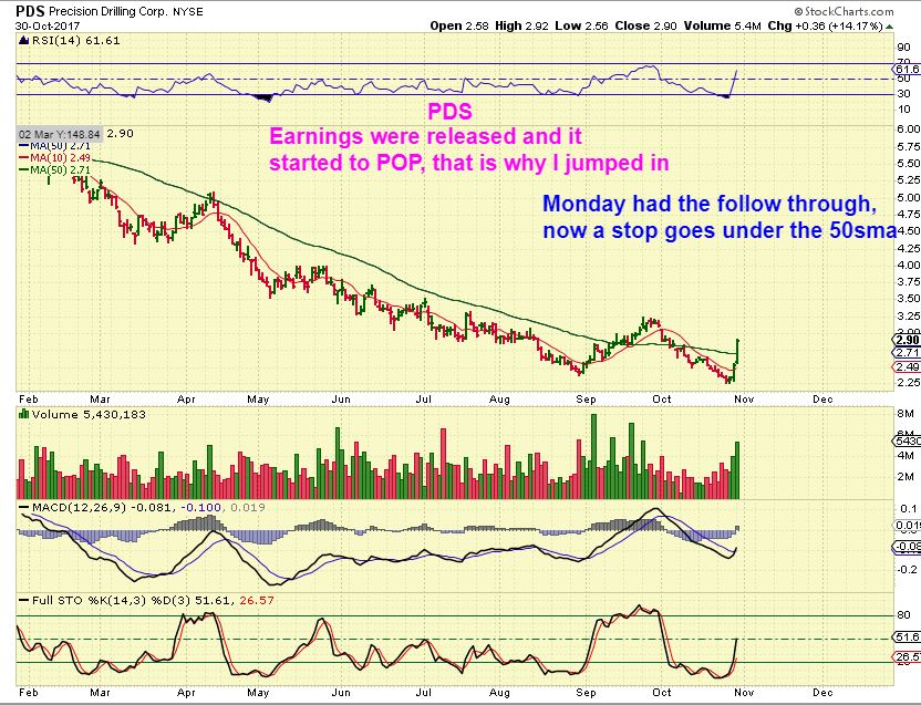 PDS – Tuesday, and I still owned it until the close.  It dipped to the 50sma, and closed under it. Why a sudden 8+% sell off after a strong run higher and flag pattern?  I dont know, but something seems to have changed.  I just want to watch this from the sidelines now, and if the Bull run continues, I will find another entrance, for now I locked in much less gains than I had at $3.20, that’s for sure.