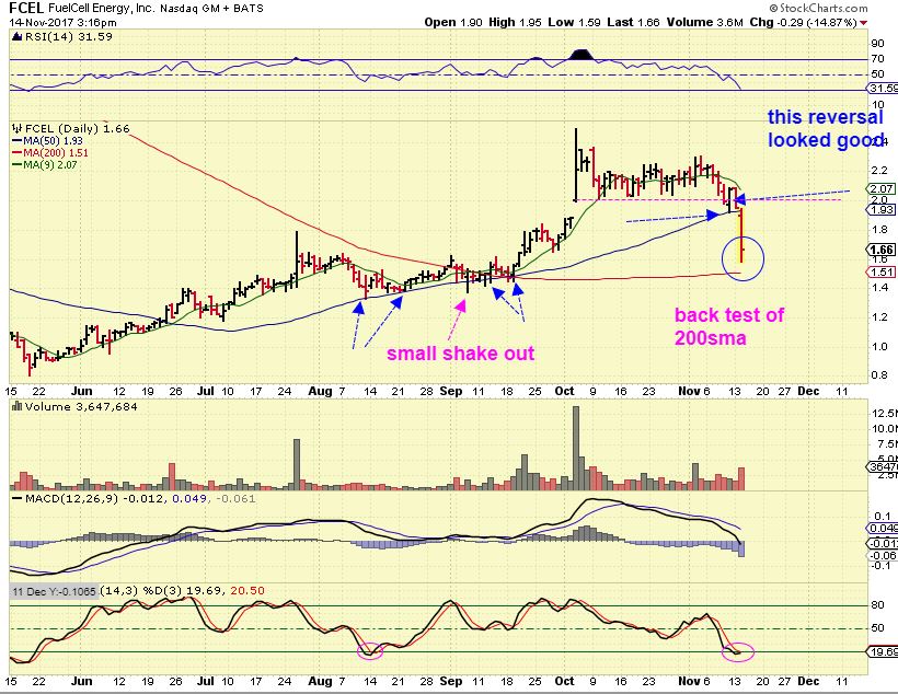 FCEL –  Fcel was fine on Monday too.  It tagged the 50sma and reversed higher Friday, and that looked good. Monday it drooped down a bit, but Tuesday it dropped 14%. It may slow up at the 50sma, but this is a sharp sell off after a strong candle higher in early October. What changed? I found NO NEWS on it.