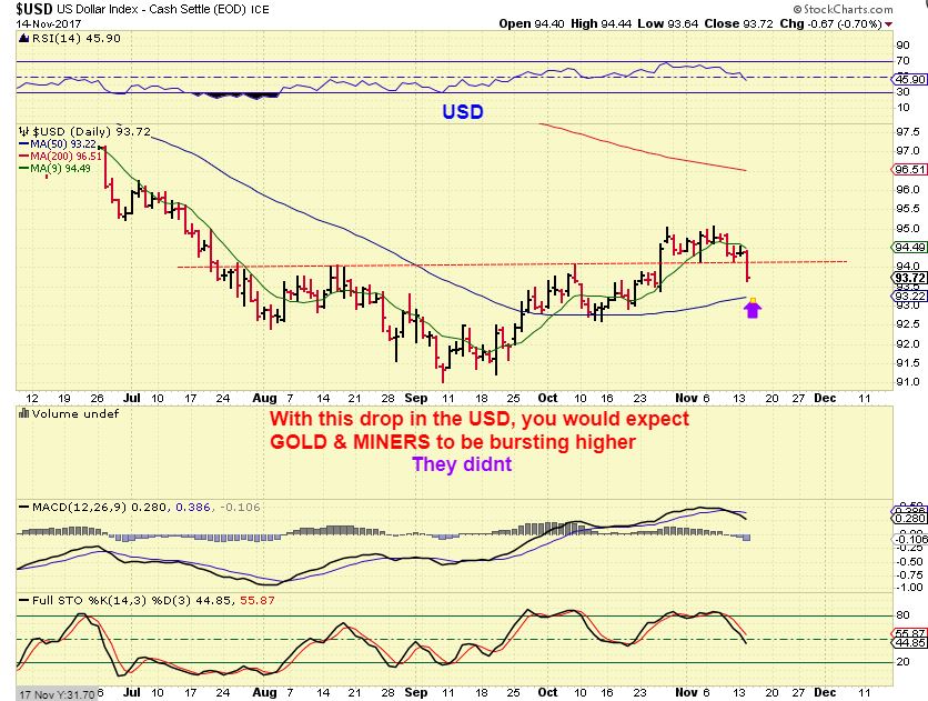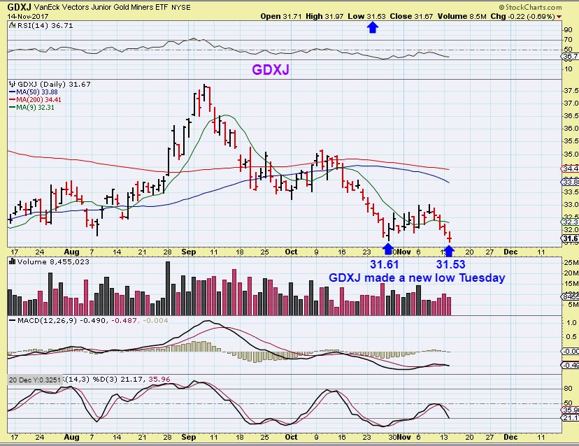 GDXJ – GDXJ actually broke to new lows on Tuesday and closed red, and that was with the USD dropping quickly. This usually indicates that when the USD puts in a dcl and moves higher, this sector will drop quickly. So that is New Lows for GDXJ.