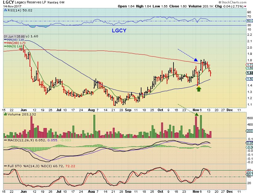 LGCY – For the next week, it too went sideways and stalled here as what looked like a flag consolidation.  Now it also dropped Tuesday toward the 50sma.  I still own it near break even, and  will have to see how it acts after the oil inventory.  I will NOT ride this below that double candle reversal under the 50sma.  You may want to sell it even before that.  It is not bearish, but it has ‘changed’.