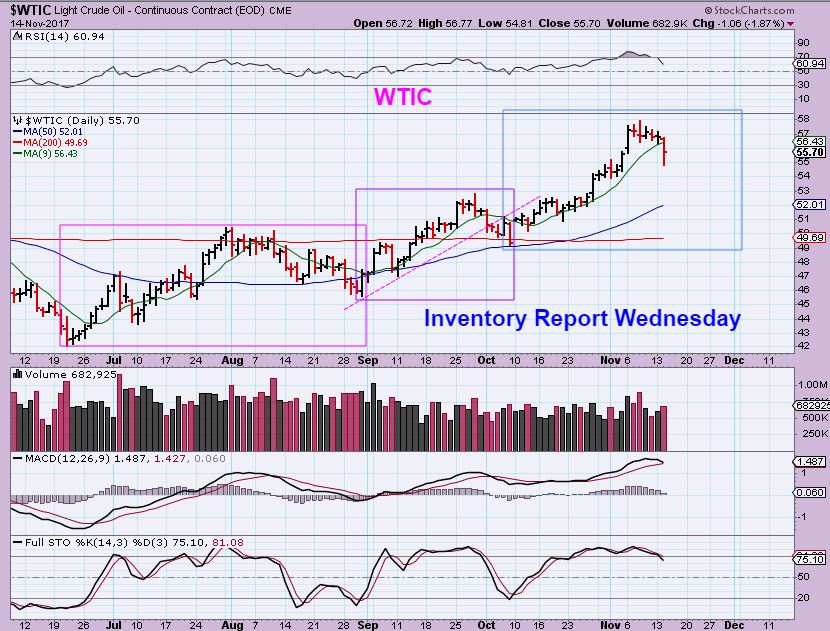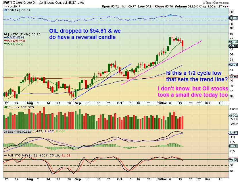 WTIC NOV 6 – This was OIL, breaking out and it could do a normal back test to the Magenta line.  I would expect that would be the $54 areaEven a drop to the Purple line was possible, but as this happened, I would have imagined that Oil stocks would hold up a bit , or just continue to go sideways, etc.