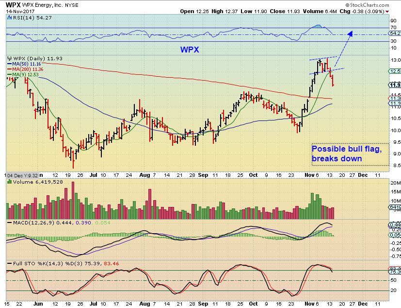 WPX – WPX was fine right up until Monday when it broke the 10sma. This was a bull flag to the 10sma after a nice strong run higher.  You can see that the winds of change are here.   It should find support at the 50 & 200 area, but if the selling in Oil continued, it could get caught up in that sell off.   Just so you know –  If I owned this, and saw this along with the XLE & OIL, it would have made me think of selling the break below the 10sma & re-entering when support proves itself.     It would depend on where I entered the trade.