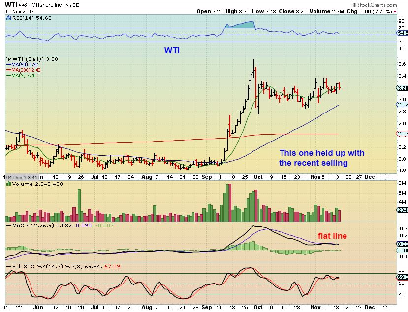 WTI –  W&T Offshore was not really affected by the recent selling in Oil or the XLE,  but as you will see, others were.  I would expect that this will get pulled down too, if the selling continues.