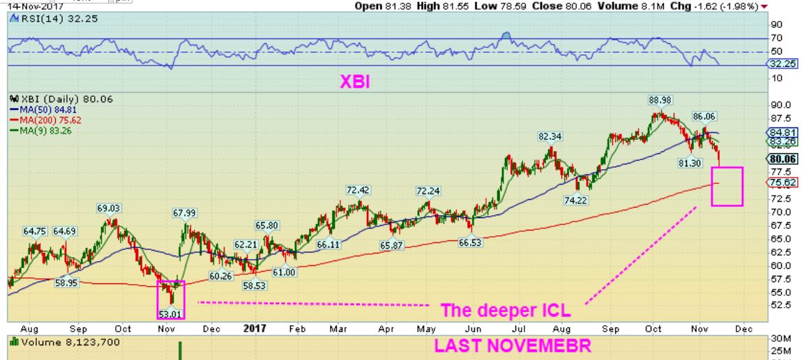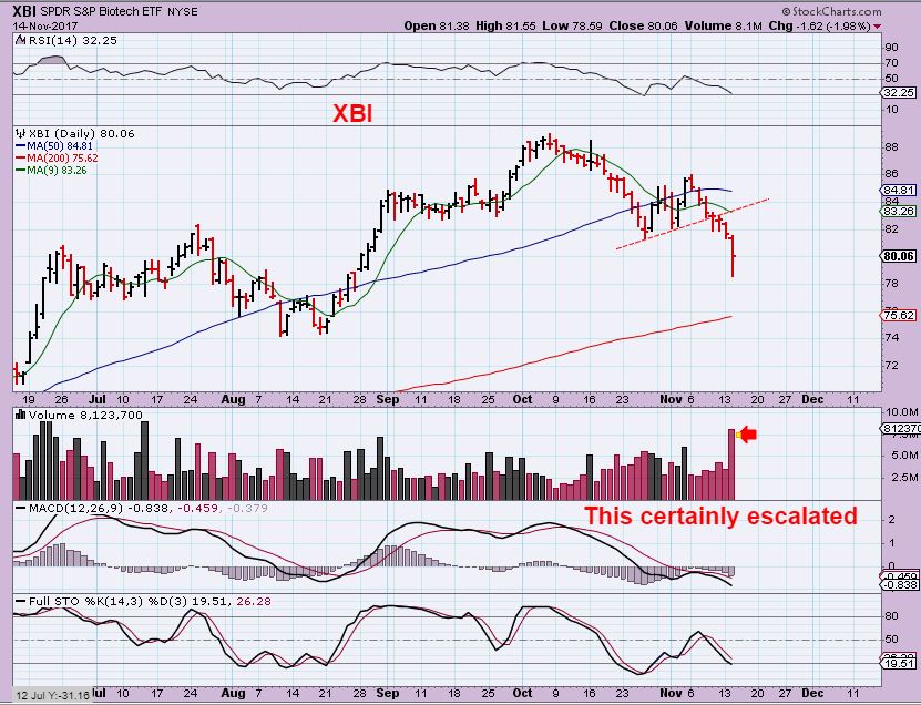 XBI NOV 8 – It then dropped back below that 50sma.  I had warned that if this breaks down below the blue line, it did not look healthy to me, since the MACD was curling down. So if it didn’t recover, that would become a break down with follow through.