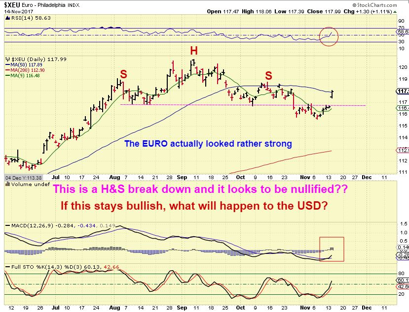 XEU or EURO  – This change surprised me.  The EURO Popped higher and actually started to close above the 50sma. It negated the H&S break down. The RSI broke above the 50% line.  This actually looks bullish and I’m not sure how this fits into the big picture, because this would usually sink the USD even further. Winds of change here, and I’ll be watching as this plays out. I thought that this could drop the USD and raise Gold, but that doesn’t fit Golds expectations – so I am watching all of this closely.