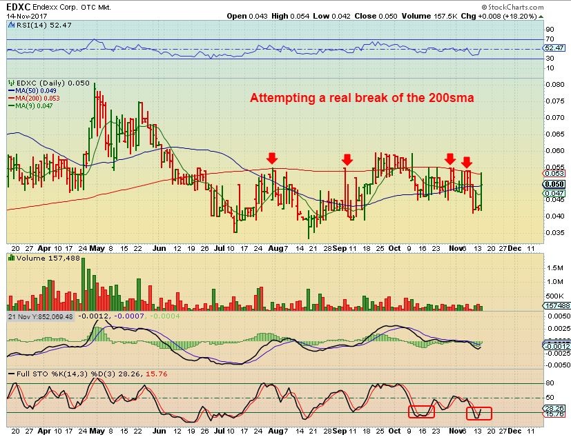 I was asked what I was currently holding.  Please know that this could change at any time, because I am a very active trader, I don’t like to hold too many positions at one time, and I may even sell one stock simply to buy another and avoid holding too many at one time.  I know that I can always get back in later.    I doubt that I will be selling the Medical Marijuana stocks unless they really sell off.  They seem to have great upside potential even as they pull back a bit. I have been asked by 1 reader to try to mention if I see a reason to sell these the Medical Marijuana Stocks, because they do move fast.  I will announce in the comments if I sell any of these, and I will also mention in my following report when I do sell  OGRMF, APHQF, SPRWF.  I sold all of my MYMMF yesterday.  Also,  I bought NAK at the $1.20 area, so I do not plan on selling NAK as long as it trades above the 50sma .