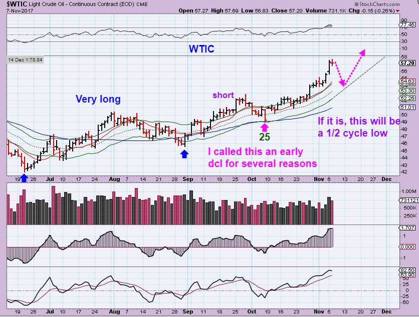 WTIC – OIL has broken out and suddenly paused at $57.69 Tuesday. We may get a 1/2 cycle low, since I think that the dcl may have been day on 25 ( see the chart) . Cycles may be confusing people here, but I am Bullish in this sector, because the individual stocks have been very bullish. Lets go bigger picture for perspective…