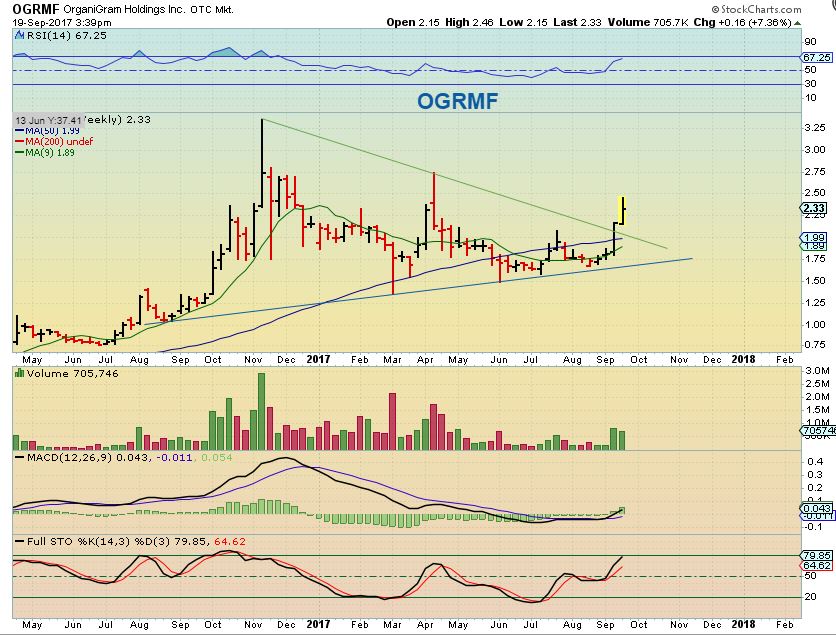 OGRMF – And this is it now, consolidated the recent gains and is currently still moving higher. I expect a run to former highs above $3.25  ( that alone is 30%) and possibly even higher the way these have been moving.