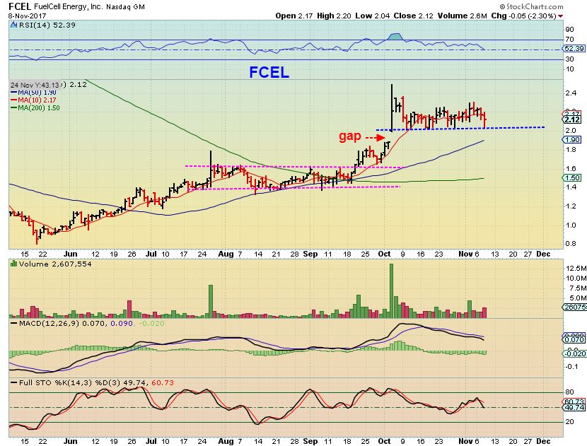 FCEL – It continues sideways, I still own it, but the last consolidation lasted for about 2 months.  This may go sideways until it reaches the 50sma , but it COULD drop & fill the gap and the 50sma now.  That does not make it bearish, it is a bullish set up at this point, unless it really starts selling off.