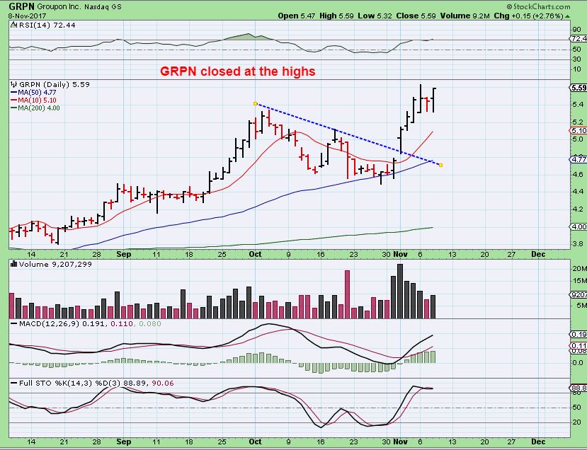 GRPN – Basically rising every day, it does seem to be heading for $6 and could just keep going higher.    The chart is still bullish longer term, and you could ride this longer if you want, but I may lock in gains soon. I just wanted to mention that for those with a longer term plan, this looks just fine.