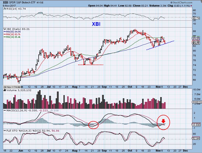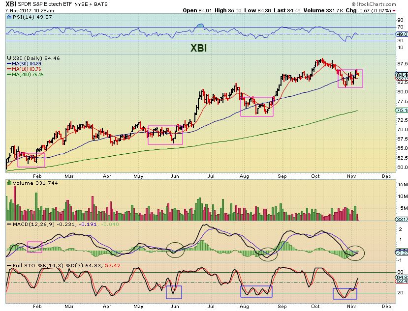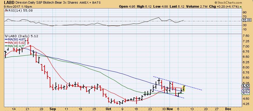 XBI – Just yesterday I mentioned that I liked the XBI at this 50sma, with the MACD about to cross up, etc .  In the comments section I was asked about  LABD  ( bear Biotech)  and I noticed that that chart looks good too, so let me review where this sector stands.
