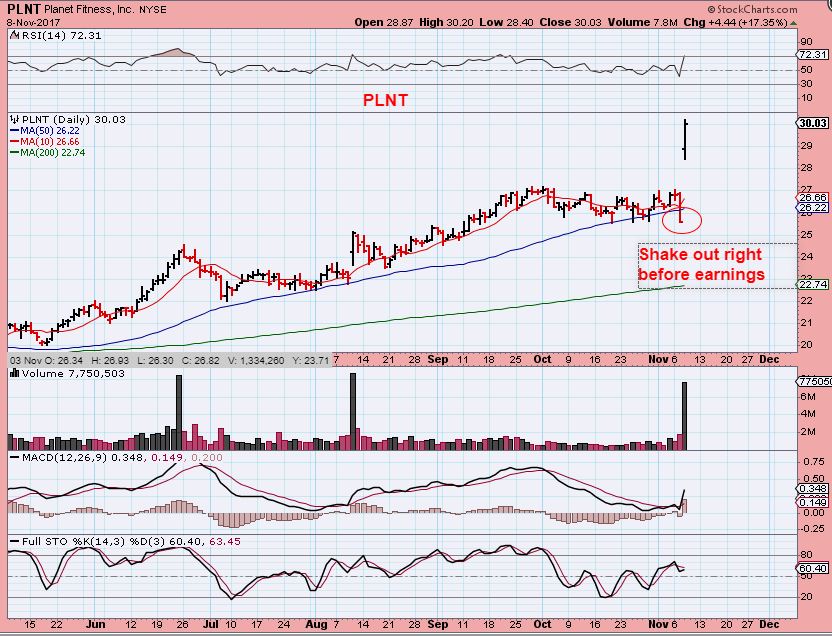 PLNT – Tuesday was a ‘shake out’ below the 50sma, I probably would have sold my position if I bought it.  and then on Wednesday, earnings come out and boom, it pops up 20%.  It is so hard when they run the stops and then it gaps open like this.  As I have mentioned before, even for the buy & hold investor riding a trend higher,  it is not as easy as it looks.