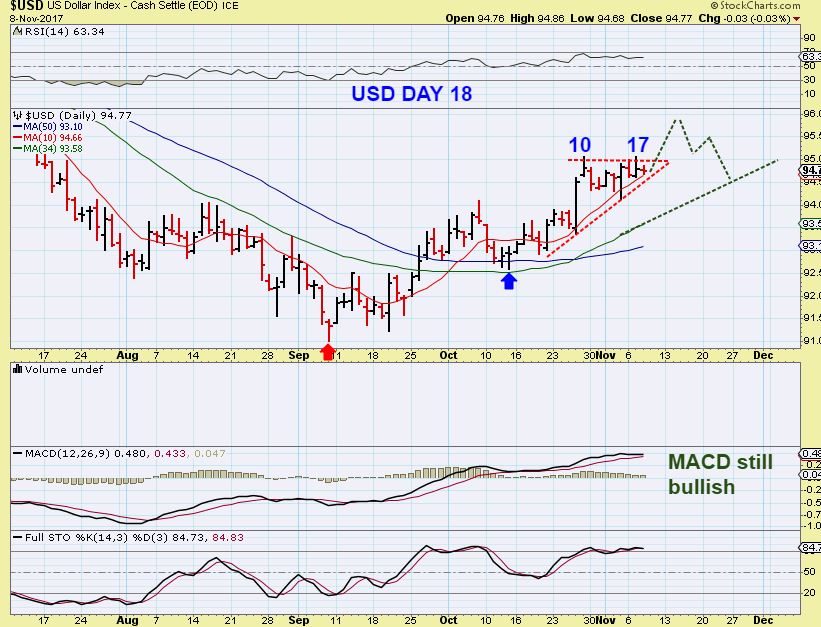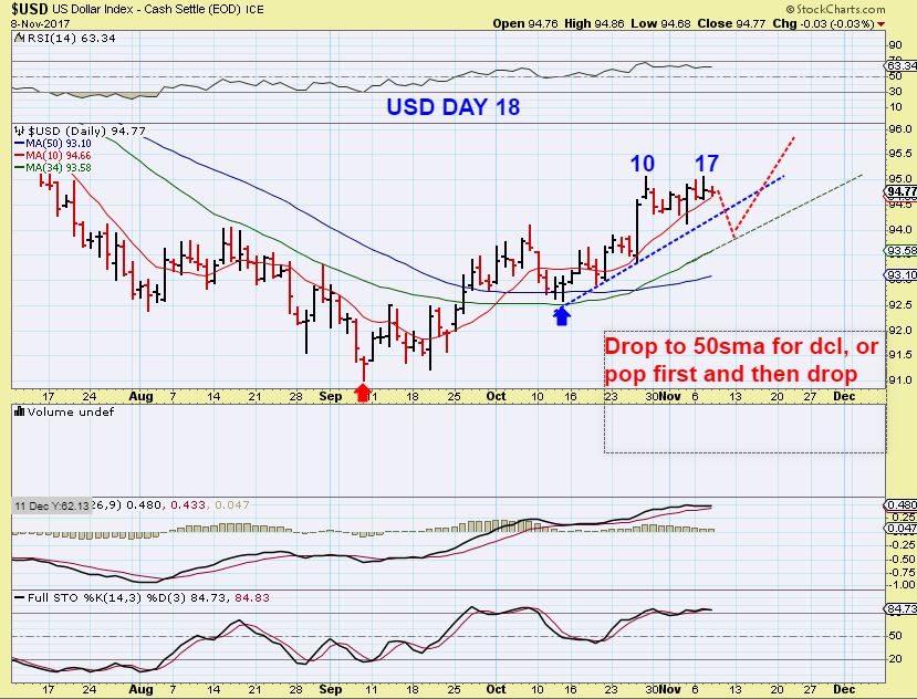 USD – On day 18, the USD can drop down into a dcl  ( the last run had a peak of day 20, and a low at day 24.  So this can drop as shown here and allow Gold to pop, or…