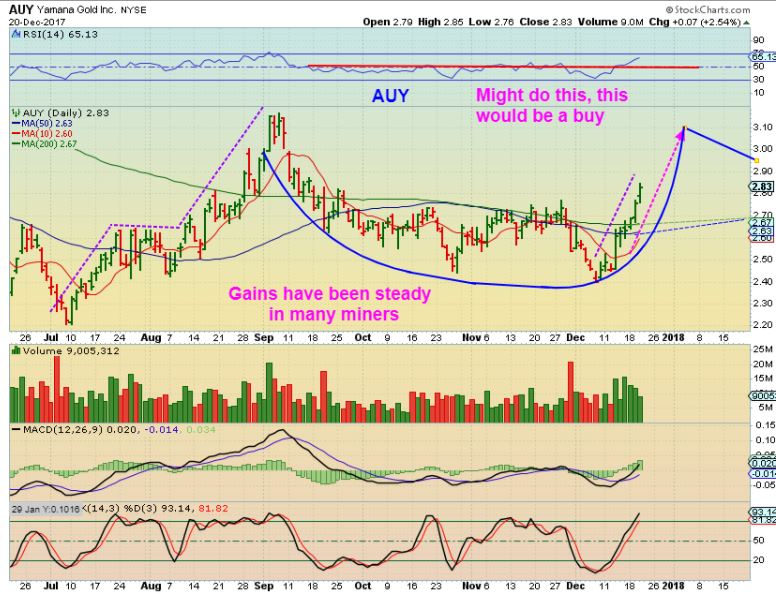 # 3 AUY JAN 2 – AUY did run to the Sept highs, but then it broke out even higher. When you look at GOLD & GDX now, they still have this pattern. THAT IS WHY I am not recommending selling, even though I discuss a Daily Cycle low coming due. It could be a shallow dip. What would AUY do next?