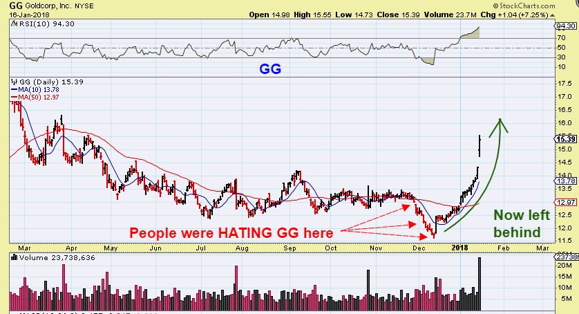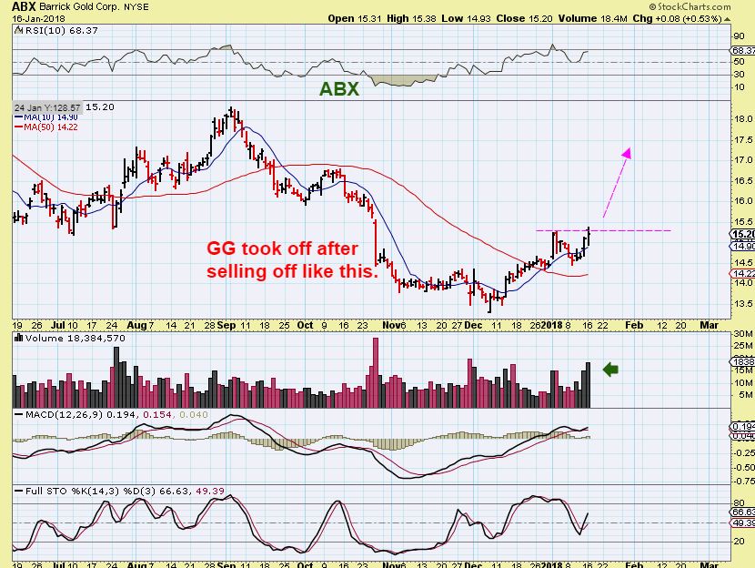 GG – Tuesday it decided that it also wanted to just keep going. Again, this is a Bullish move out of the long base that formed recently in all of that sideways action. Like AUY, this is also taking off higher to 2017 highs. Selling GG last week or the week before would have left someone behind.