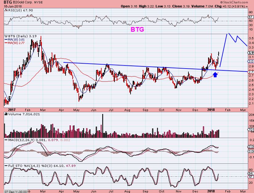 BTG – I did point out the back test of the blue line as a good entry point, and it is running up to finish its next target ( $3.50). Most of the Miners are acting very well.