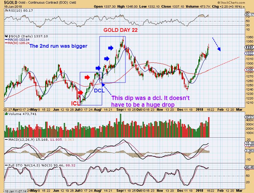 GOLD FRIDAY on day 21 from the weekend report. Golds dip did not meet the criteria for a DCL, so we viewed this as still the first daily cycle with a 1/2 cycle low. That means that we would be expecting a dip into a daily cycle low possibly starting later this week or even next week. They often come around 30- 33 days lately, but they can come at any time now.