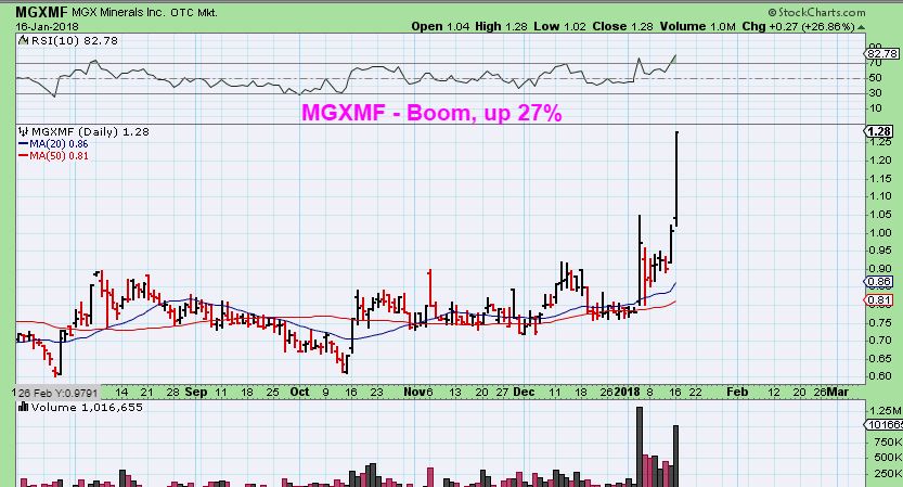 MGXMF – I recommended this strongly on Jan 5th as it held at the 10 & 30 weekly MA. I said that this long tight base looked ready to go, and I also bought it. I think I wrote that I expected it to run back to former highs eventually. That is what I expect (And possibly a lot more if the set up remains bullish). Next chart…