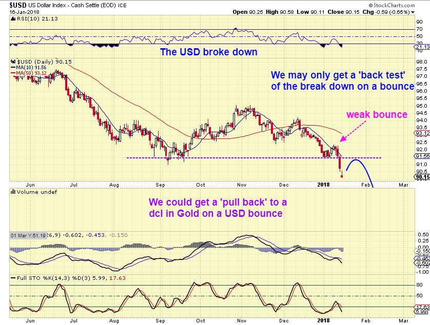 The USD – The USD broke down below Sept lows, as mentioned in the weekend report. We could get a bounce & a back test before continuing lower. Note: We are entering the ‘timing’ for a dip into the daily cycle low in Gold. I mentioned that I don’t think that the recent dip in Gold was a dcl. So soon a weak Bounce in the USD may be enough to stall Golds upward progress and give us a dip into a dcl ( a buying opportunity). I will discuss this in Gold & Miners.