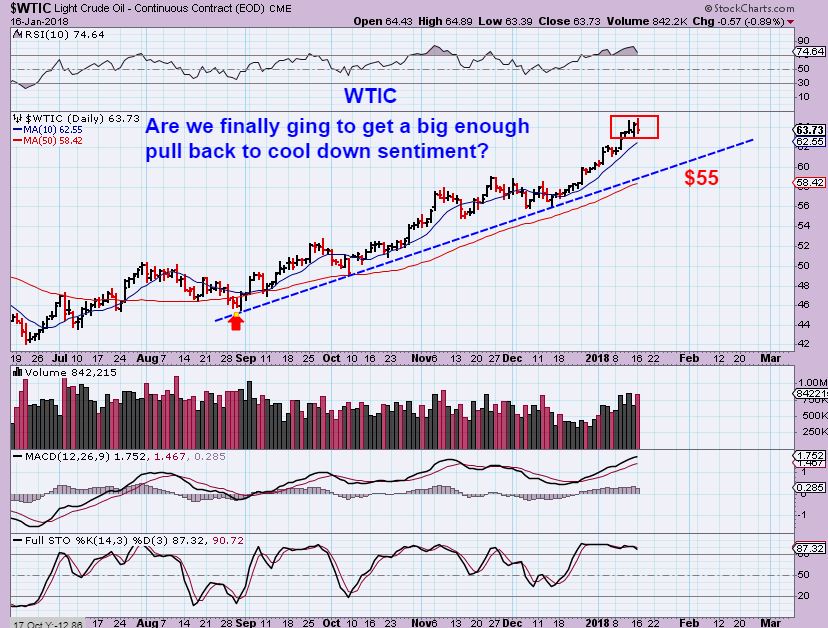 WTIC – Oil also reversed Tuesday, and we have been expecting a drop after this strong break out above $60. The COT shows that the Smart Money is very short, I am ‘expecting’ a drop to the blue trend line, but Oil has been strong. We’ll see what the Oil Inventory report does this week (Which may be delayed to Thursday due to the holiday). A drop will be a buying opportunity in Oil & Energy.