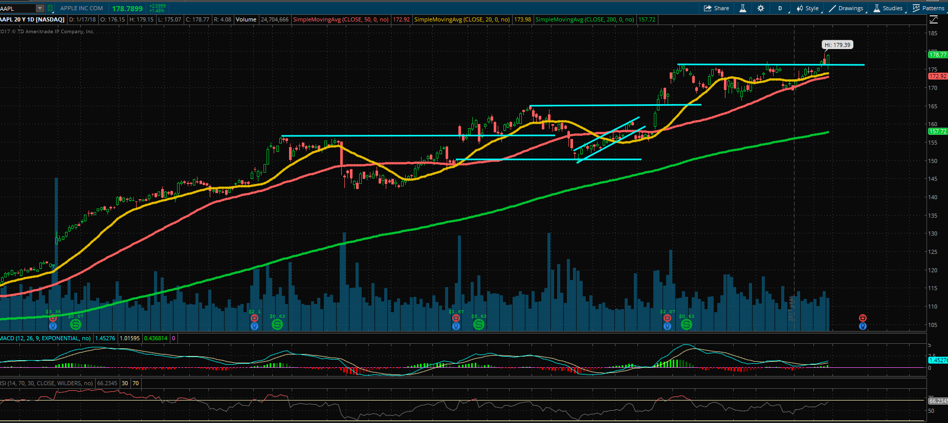 When i look at AAPL from May 2017, it is moved higher, but it has been so difficult to ride. Some pretty steep drop offs in that move higher, and lots of consolidations.