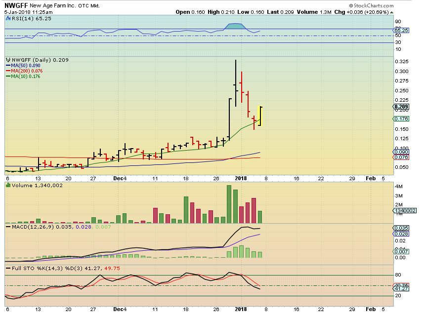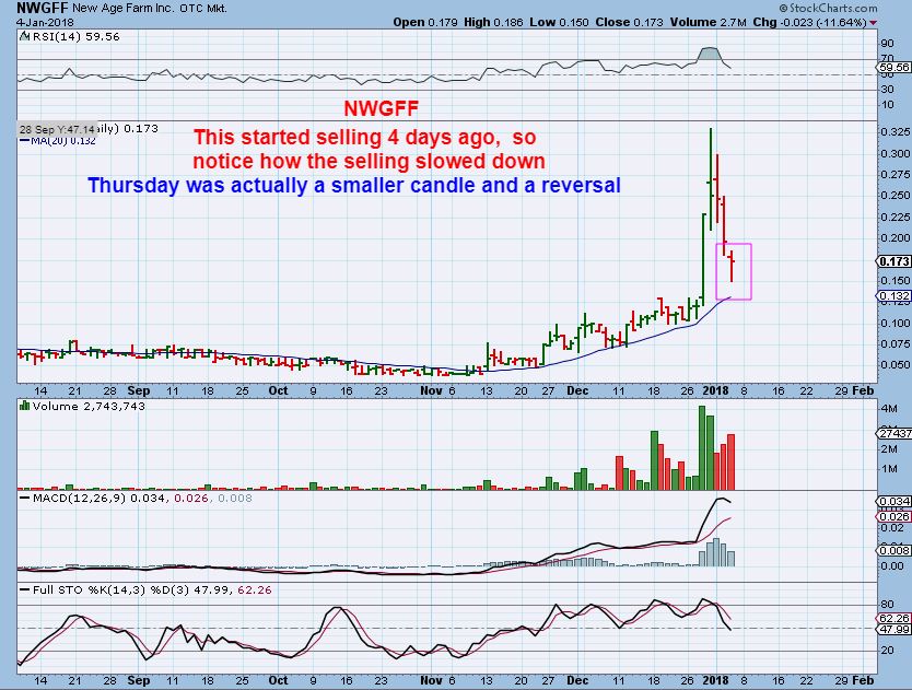 NWGFF – I put this in Fridays report to make a point, please read the chart. You can see that this was extended and actually started selling midday in December. On the BIG sell off Thursday, sellers were almost done, so we saw a reversal. My point was: Is the selling really almost done in this one?