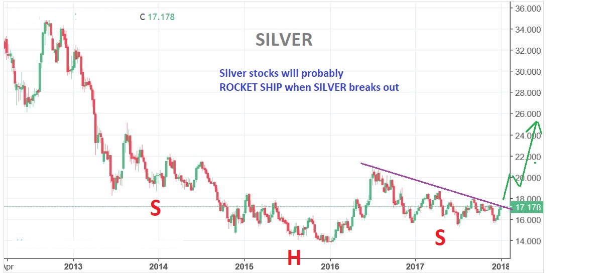 SILVER – I honestly think that the run we are going to get in 2018 is similar to the one we had in 2016, so this should eventually break out and the technical buyers will then want to own Silver (and silver stocks). We are positioning ahead of them. This looks like a GIANT multi-year inverse H&S.