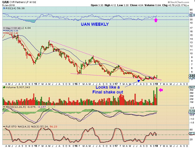 UAN WEEKLY – CVR Partners LP is a holding company, which engages in the fertilizer business. Its products include ammonia and urea ammonium nitrate fertilizers. This weekly chart looks quite bullish, but the daily gapped open Friday, so I am going to see if we get a gap fill. It ran from $3.30 to $4.12 last week.
