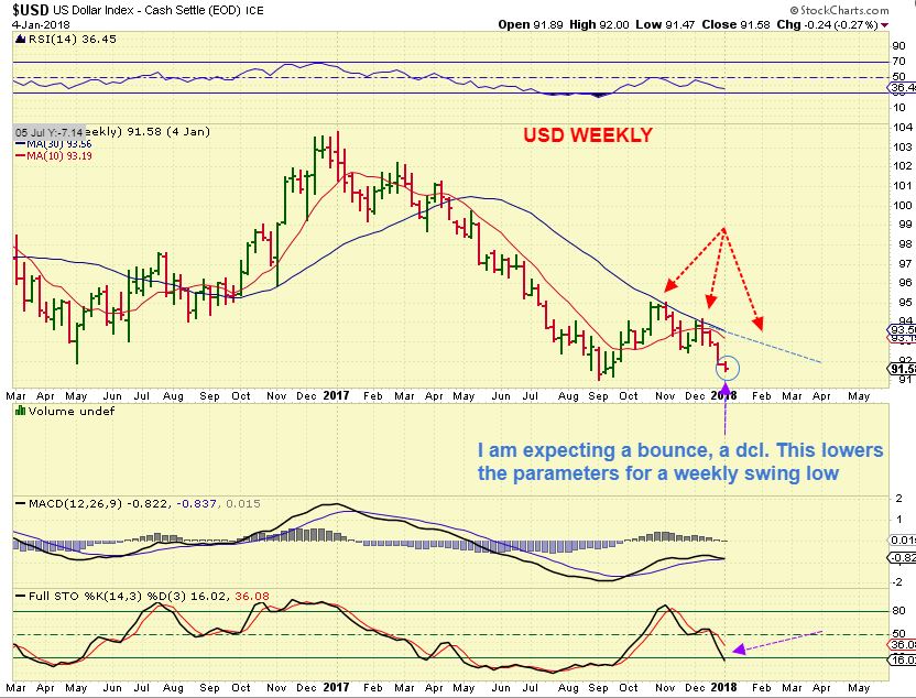 USD WKLY- We have lowered the parameters for a weekly swing low in the USD. It is due for a low. I expect a weak bounce, see the chart.